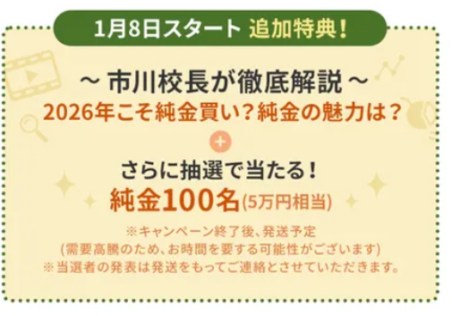 今回は「2025年投資市場の総復習」をテーマにした動画に加え、市川校長による2026年の相場大予想も特典として用意されていますよ。