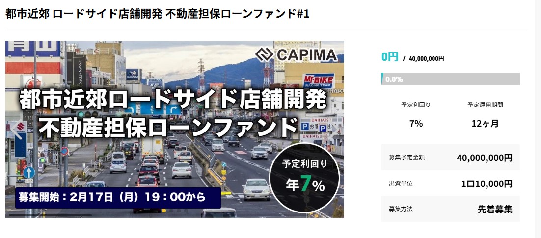 >>投資応援キャンペーン<<>>キャンペーン詳細はこちら<< capima 都市近郊 ロードサイド店舗開発 不動産担保ローンファンド#1 X Facebook はてブ Pocket LINE Pinterest 2025.02.16