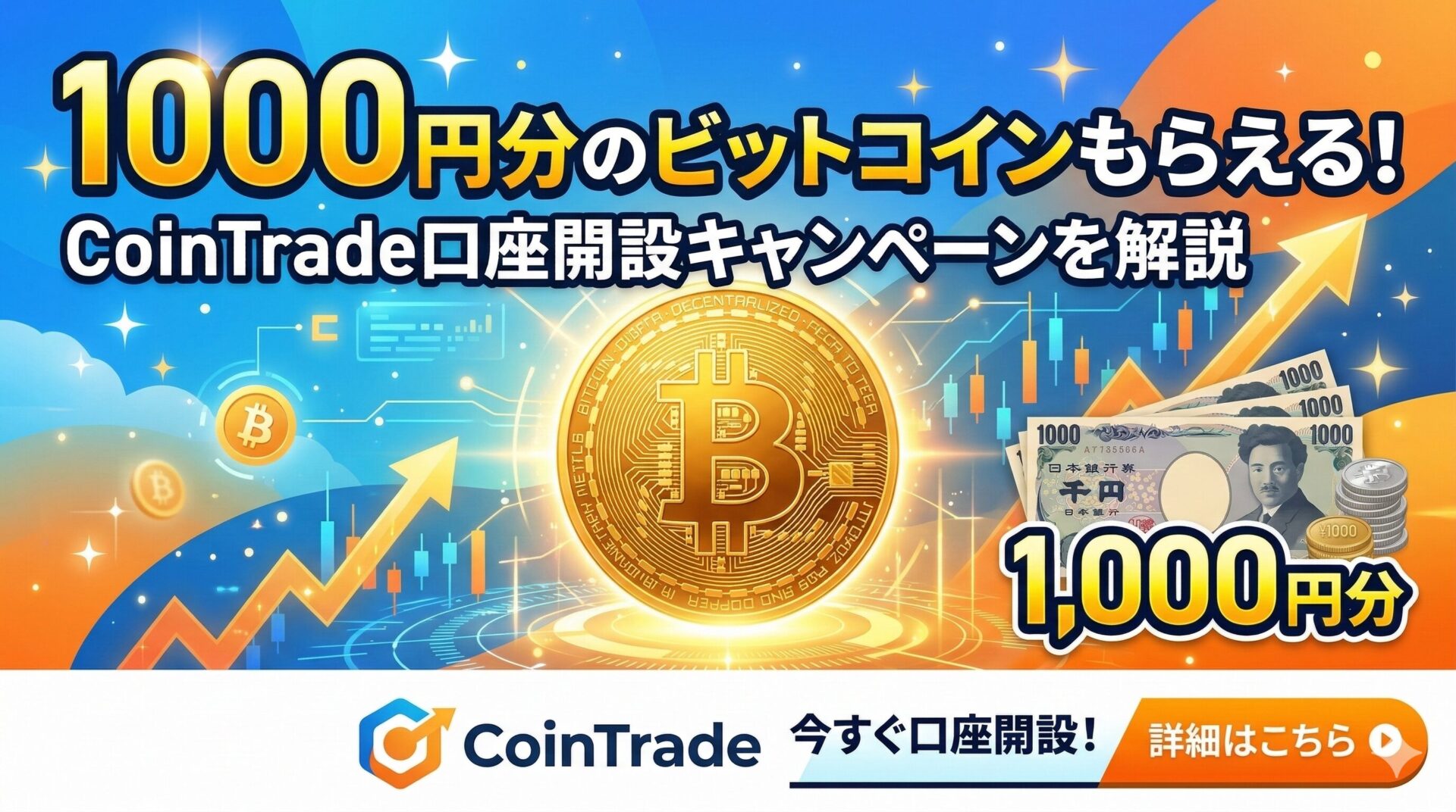 CoinTrade(コイントレード)では、口座開設だけで1,000円相当のビットコイン(BTC)がもらえるキャンペーンを実施しています。
