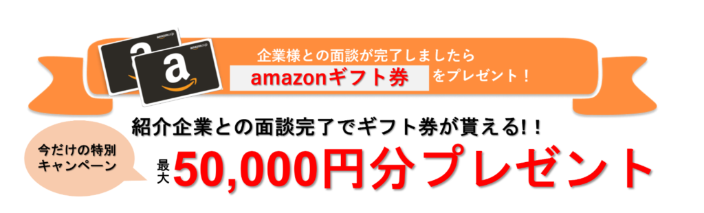 現在、サイト経由で紹介企業との面談を完了すると、最大50,000円分のAmazonギフトカードがもらえるキャンペーンを実施中。