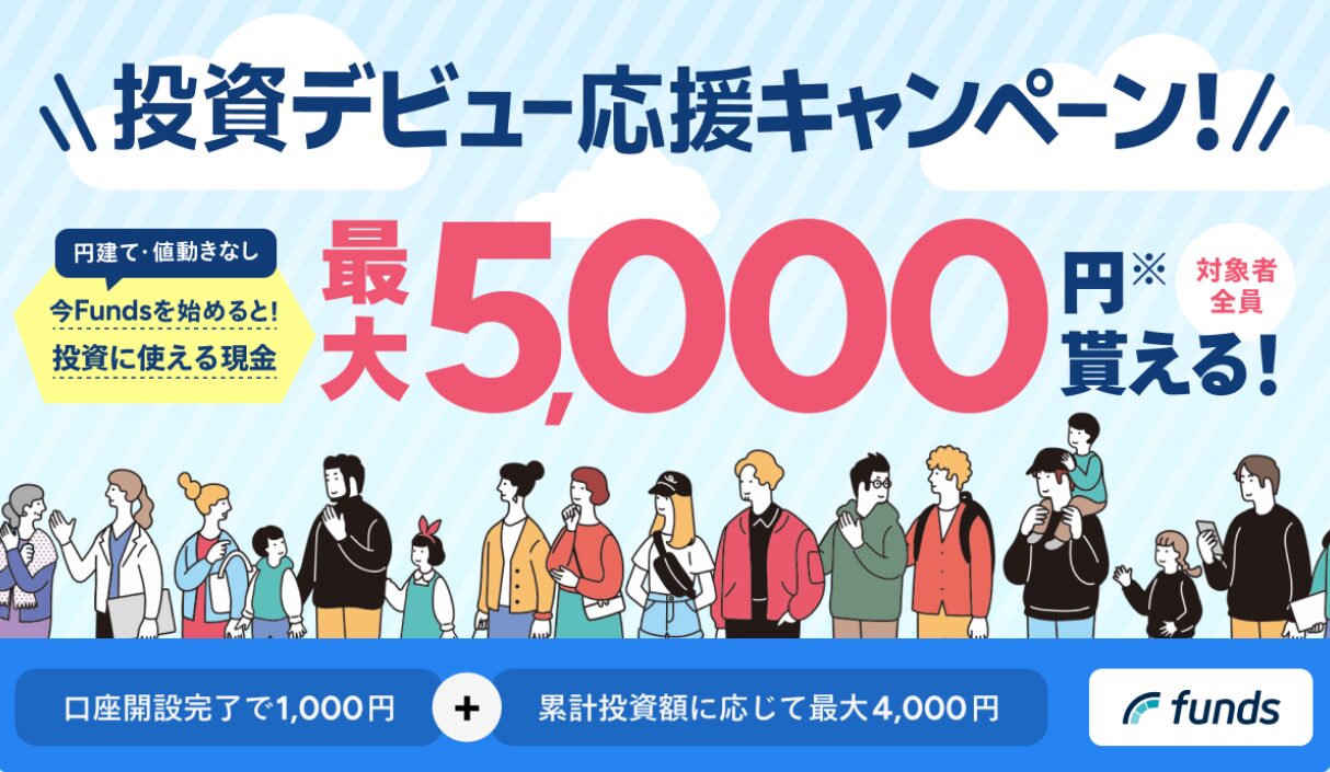 現在、Fundsでは投資デビュー応援キャンペーンが実施されており、口座開設&投資で最大5,000円使える現金をプレゼント!