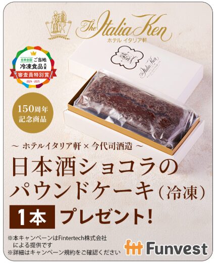 出資した方から抽選で抽選で10名様に「【ホテルイタリア軒×今代司酒造】日本酒ショコラのパウンドケーキ 」をプレゼント!