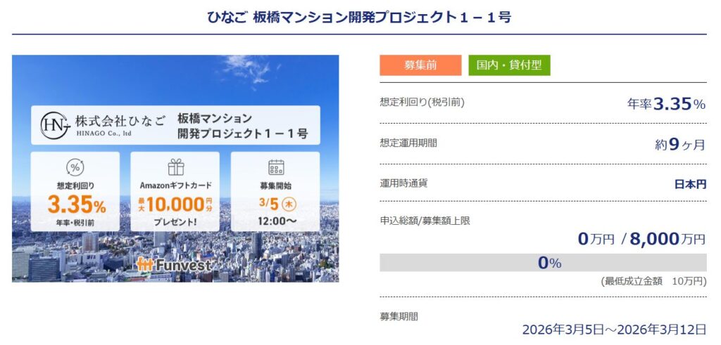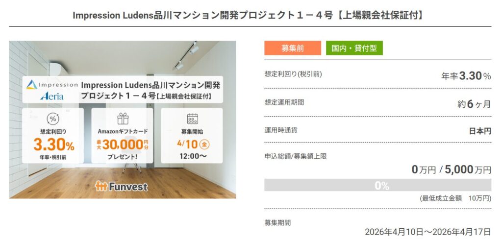 | Funvest | 登録でアマギフ1,000円分 投資でさらに1,500円 期間未定 |