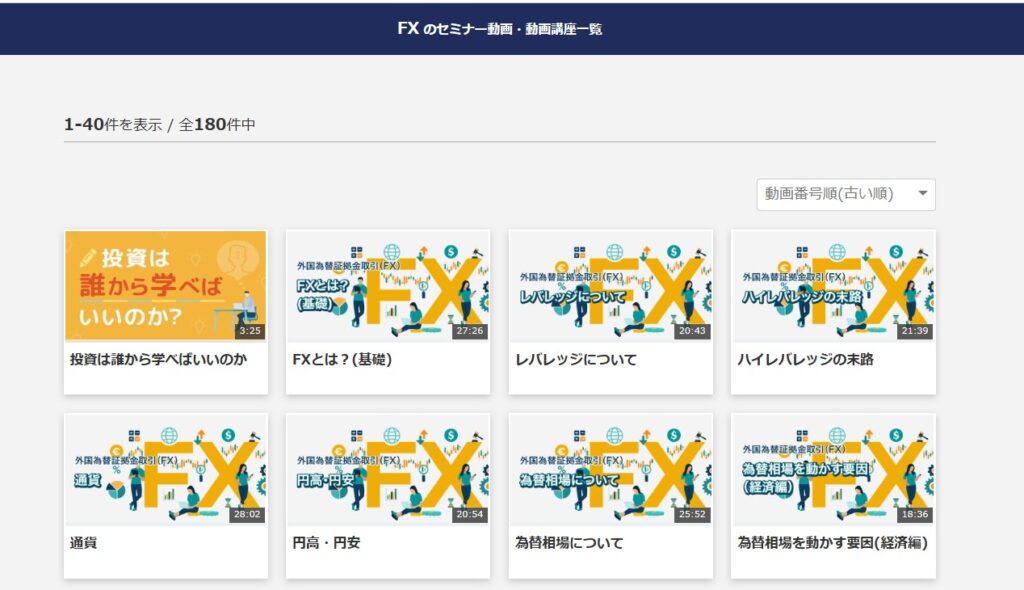 株式投資を中心に、FXの講義(約180本)も充実しており、チャート分析や資金管理など実践的な内容を幅広く学べます。