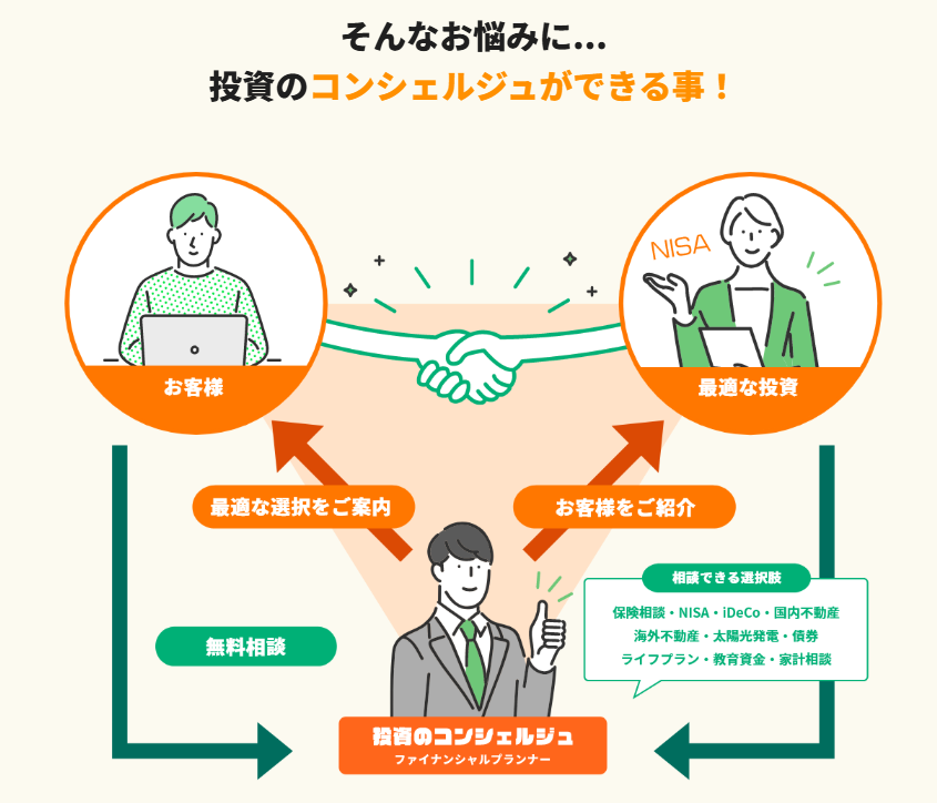 普通なら「銀行で投資信託」「不動産屋で物件」とあちこち回らないといけないのが面倒ですが、投資のコンシェルジュは幅広い商品をまとめて相談できるのが強みです。