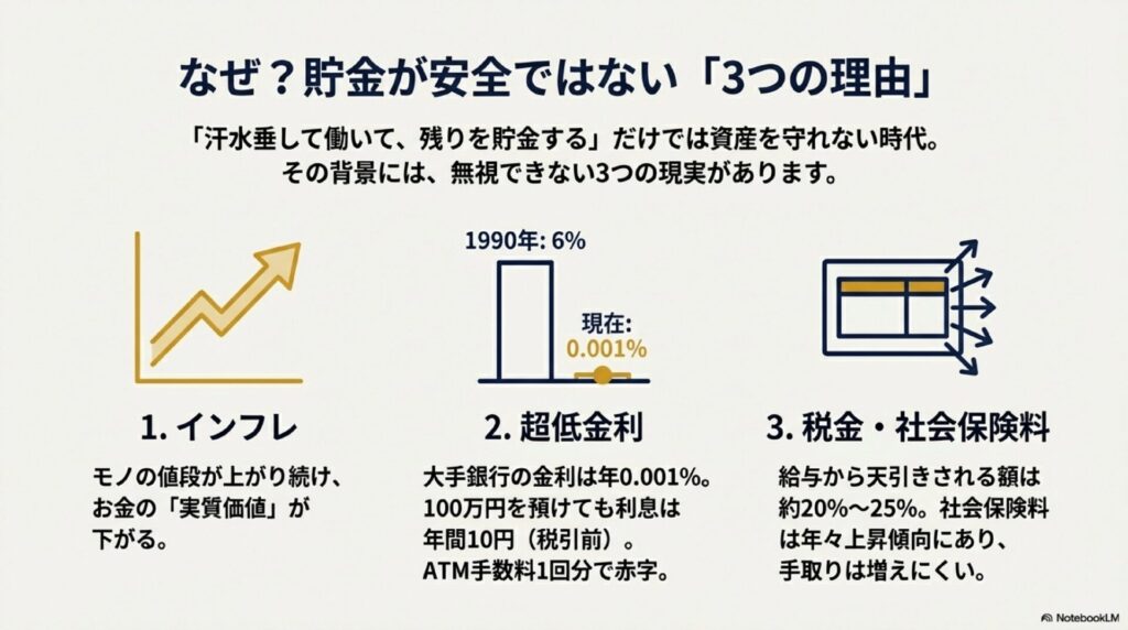 多くの人が「投資は怖い」「貯金が一番安全」と思っています。しかし、現代においてその常識はすでに崩れています。なぜ「貯金だけ」ではダメなのでしょうか?