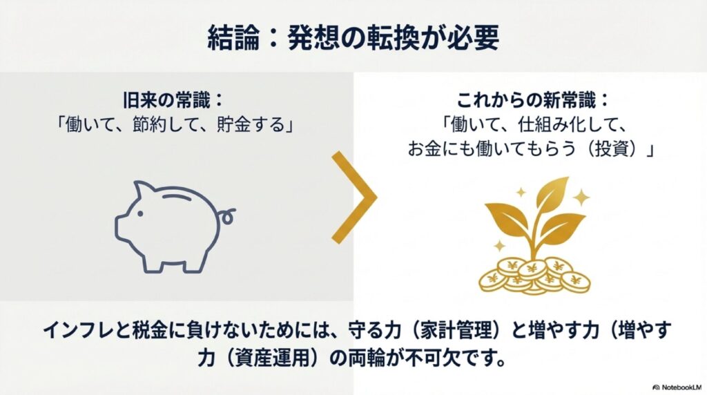 「汗水垂らして働いて、残りを貯金する」だけでは、インフレと税金に負けてしまいます。だからこそ、「お金自身に働いてもらう(投資)」という発想が必要不可欠なのです。