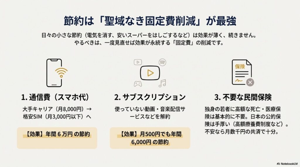 やるべきは「固定費」の削減一択です。一度手続きすれば、効果が永続します。