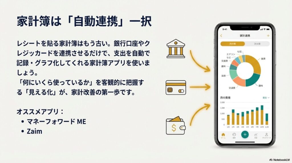 「レシートを貼る家計簿」は続きません。家計簿アプリ(マネーフォワード ME や Zaim)を使いましょう。銀行口座やクレジットカードを連携させれば、「何にいくら使ったか」を勝手にグラフ化してくれます。