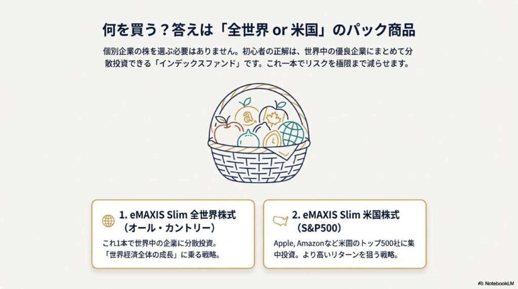 「どの会社の株を買えばいいの?」と迷う必要はありません。初心者の正解は、「世界中の企業に分散投資できるパック商品(インデックスファンド)」を買うことです。