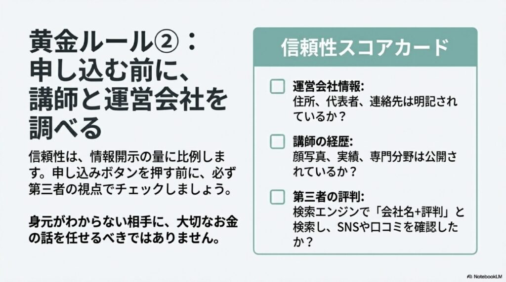 - 講師や運営会社の情報を事前に調べる