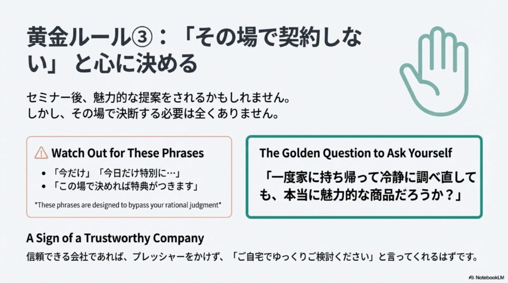 これらの不安をふまえ、カモにされないためには、事前に目的を確認し、運営元を調べ、セミナー中にその場で契約しないことが大切です。