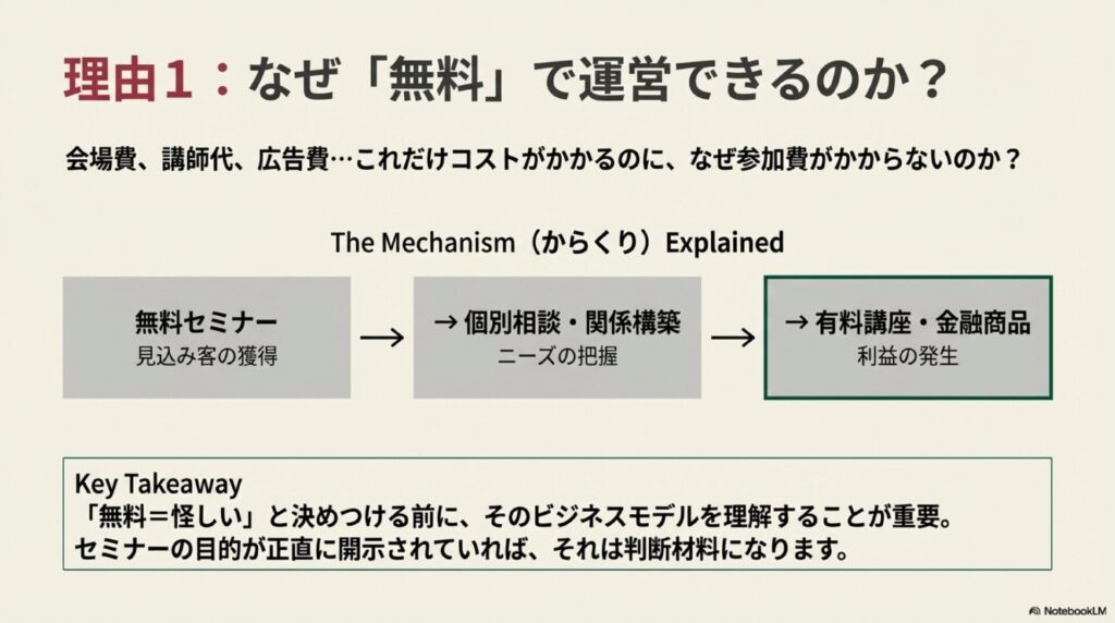 だからこそ、「無料=怪しい」と決めつける前に、なぜ無料で開催できるのか、その“からくり”を理解しておくことが大切です。