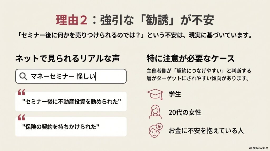 もちろん、すべてのセミナーがそうではありませんが、こうした体験談や不安の声がネット上に多く出回っていることで、「マネーセミナー=何かを売られる」という印象が強くなっているのも事実です。