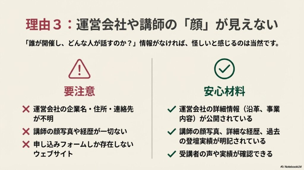 たとえば、企業名や代表者、住所などが書かれていない、講師がどんな人なのかまったく紹介されていないといったケースは要注意です。
