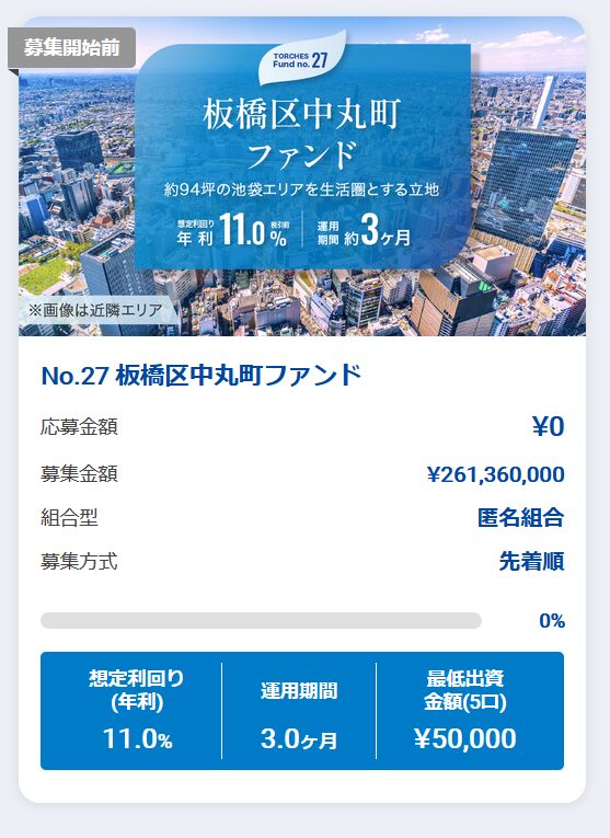 4月8日(水)12時に募集スタートする「No.27 板橋区中丸町ファンド」は、運用期間3ヶ月のファンドです。