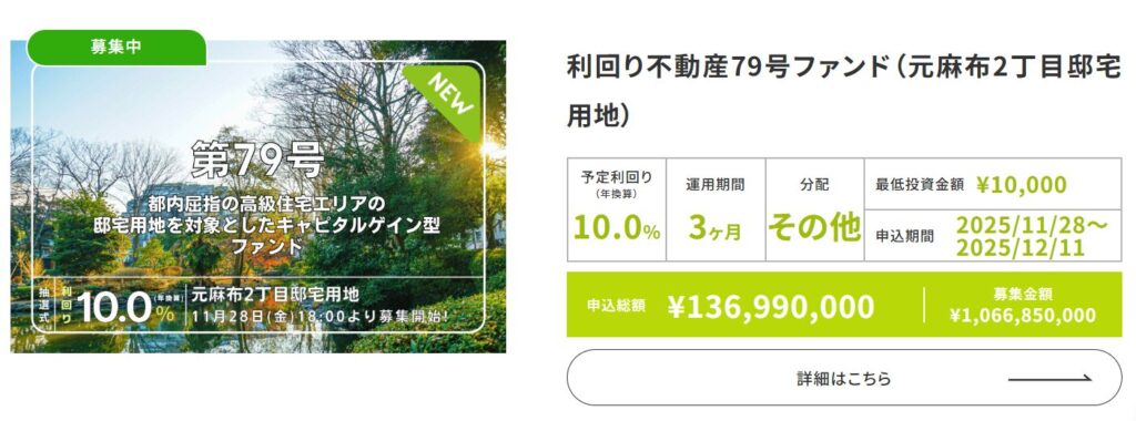 例えば、2023年10月に募集されたファンドでは、1万円から投資が可能で、利回りは6.5%、運用期間は18ヶ月でした。