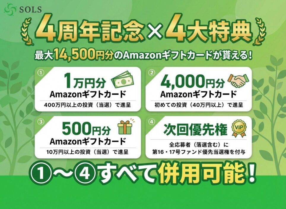 SOLSでは4周年を記念して、対象ファンドで投資すると特典が受け取れるキャンペーンが始まります。内容はAmazonギフトカードと、次回ファンドの優先当選権です。
