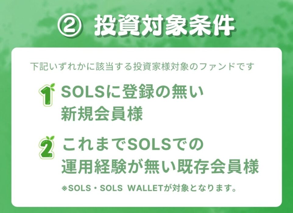 - SOLSで運用経験がない既存会員(SOLS/SOLS WALLETの利用歴がない方)