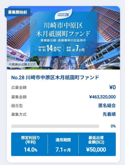4月13日(月)12時に募集スタートする「No.28 川崎市中原区木月祇園町ファンド」は、想定利回り14%のファンドです。