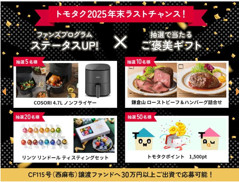 不動産クラウドファンディング「トモタク」では、アマギフやご当地ギフトが受け取れる出資キャンペーンが開催されることが多く、条件達成で特典を受け取れる取り組みも用意されています。