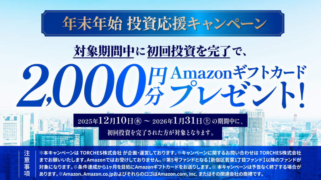 現在TORCHESでは、Amazonギフトカード2,000円分がもらえる年末年始投資応援キャンペーンを実施中です。