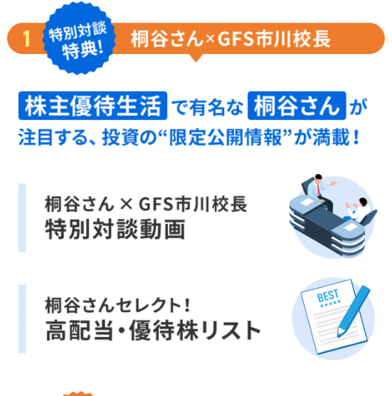 株主優待生活で知られる桐谷さんと、GFS市川校長による特別対談を紹介する特典内容。