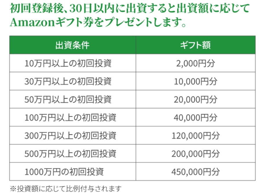 さらに、登録から30日以内に行った初回投資額に応じて、最大45万円分のAmazonギフトカードが受け取れます。