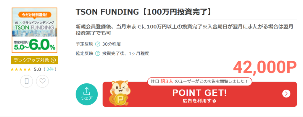 モッピーで42,000ポイントを獲得するには「新規会員登録後、当月末でまで100万円以上の投資完了」が条件なので、かなりハードルが高いです。