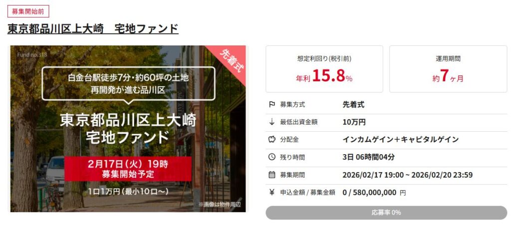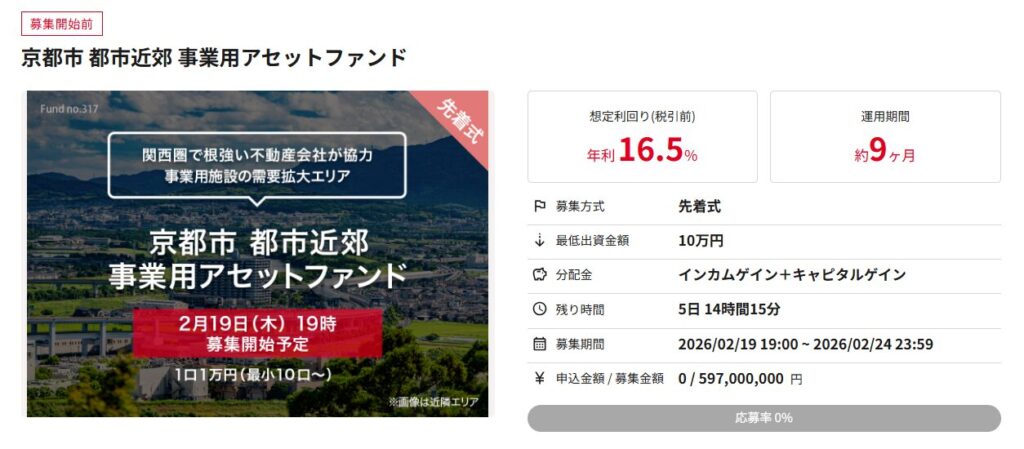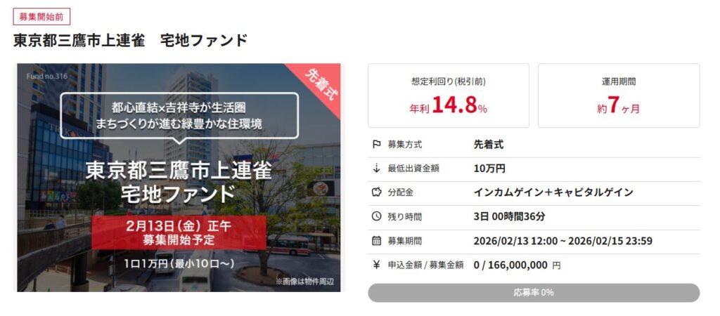ファンド公開して、すぐ募集がはじまるので多いので、気になる方は先に会員登録だけでも済ませてせておきましょう。